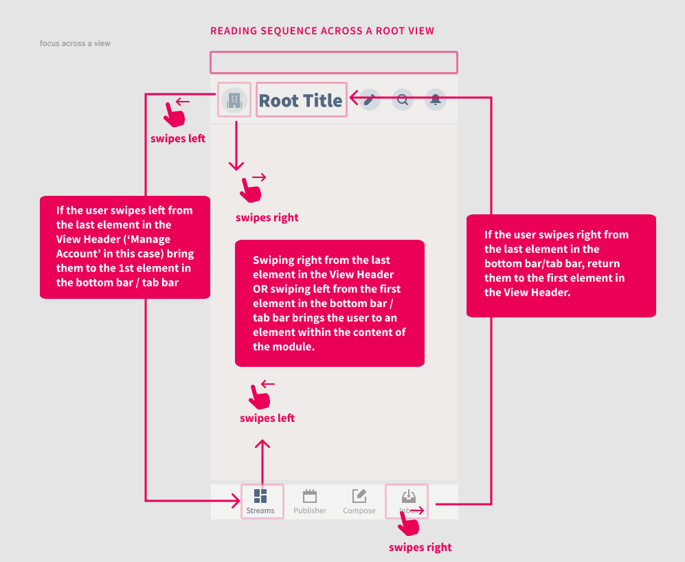 WCAG 2.0 criteria were considered for every component and pattern in the design system. In this example, I defined an app-wide focus order for users navigating by screen reader.